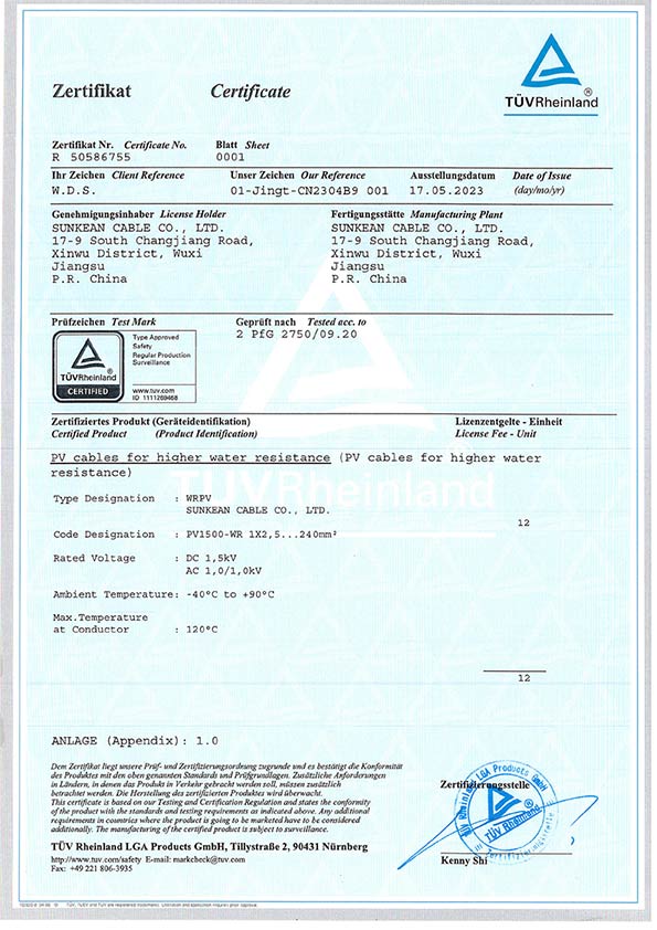 2 PfG / 2750 شهادة كابل الطاقة الشمسية