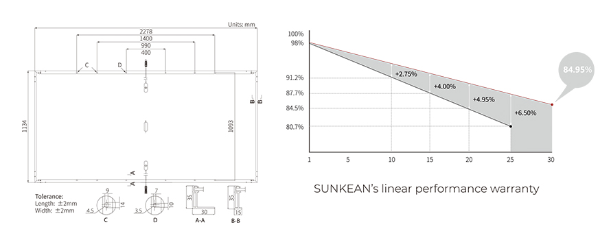 تتميز الوحدة الكهروضوئية نصف الخلية أحادية الخلية بقدرة 550 وات وموثوقية أكبر ، وهي مناسبة لمحطات الطاقة الكبيرة جدًا. باستخدام الزجاج على الوجهين ، تكون كفاءة توليد الطاقة أعلى.