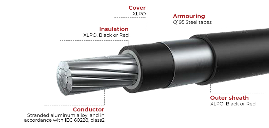 خال من الهالوجين. كابل جهد منخفض مقاوم للأشعة فوق البنفسجية. كابل الألومنيوم TÜV2642 مناسب بشكل خاص للتطبيقات الخارجية والدفن مباشرة في الأرض.