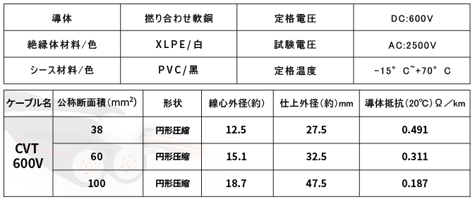 كابلات CVT (اختصار "الكابلات المغلفة بالفينيل المعزولة بالبولي إيثيلين المتقاطع") هي منتجات قياسية من JIS، وهي عبارة عن كابلات CV أحادية النواة مجدولة في كابلات الطاقة، وتستخدم لنقل وتوزيع جميع الطاقة الكهربائية، بدءًا من الجهد المنخفض إلى الجهد العالي.
