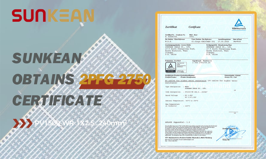 في 24 مايو 2023 ، في المؤتمر والمعرض الدولي السادس عشر للطاقة الشمسية الكهروضوئية والطاقة الذكية (SNEC) ، أصدرت TUV Rheinland الكبل الكهروضوئي العائم 2 PfG 2750 الشهادة القياسية لـ SUNKEAN. SUNKEAN في طليعة الصناعة في البحث والتطوير وتصنيع الكابلات الشمسية العائمة. لقد كانت ملتزمة دائمًا بالمساعدة في تطوير الصناعة الكهروضوئية وتنويع التطبيقات الكهروضوئية ، وتعزيز عملية توحيد الصناعة بنشاط.
