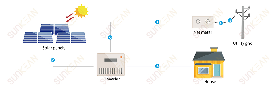 2. on-network— المعروف أيضًا باسم نظام الطاقة الشمسية الذي يتم توصيله بالشبكة أو نظام التغذية الشبكي