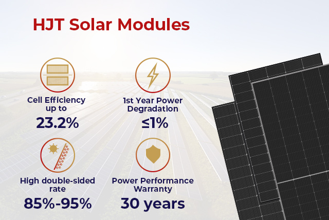 كفاءة عالية: تتمتع الألواح الشمسية HJT بكفاءة تحويل تبلغ 26.07% للوحدات أحادية العرق وأكثر من 30% للوحدات ثنائية الجانب، مما يجعلها واحدة من أكثر تقنيات الطاقة الشمسية كفاءة في الصناعة.