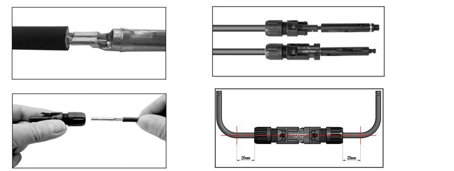 - لا يوصى أبدًا بالتوصيل البيني أو "التقاطع" للموصلات الكهروضوئية من مختلف العلامات التجارية. مما قد يتسبب في حدوث اتصالات محترقة وفشل في الانحناء ووقوع حريق.