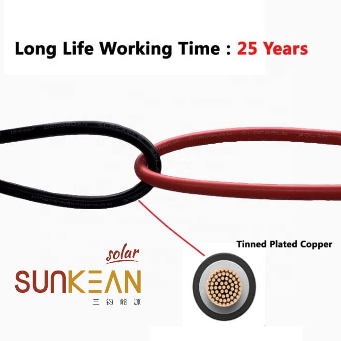 تتعرض الكابلات الكهروضوئية باستمرار لأشعة الشمس وغالبًا ما تعمل الأنظمة الشمسية في ظل ظروف بيئية قاسية مثل درجات الحرارة المرتفعة والأشعة فوق البنفسجية. في الأيام المشمسة ، يمكن أن تصل درجة حرارة موقع النظام الشمسي إلى 90-100 درجة مئوية. الكابلات الشمسية SUNKEAN معتمدة من TUV / CE / UL ، المتخصصة في العمل للنظام الشمسي. إذا اخترت كبلات PVC عادية بدلاً من الكابلات الكهروضوئية ، فمن الواضح أنها ستؤثر بشكل كبير على عمر خدمة النظام الشمسي.