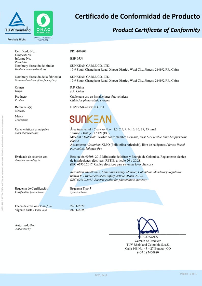 يوفر الحصول على شهادة RETIE ضمانًا قويًا للكابلات الكهروضوئية SUNKEAN H1Z2Z2-K / 62930 IEC131 لدخول السوق الكولومبية.