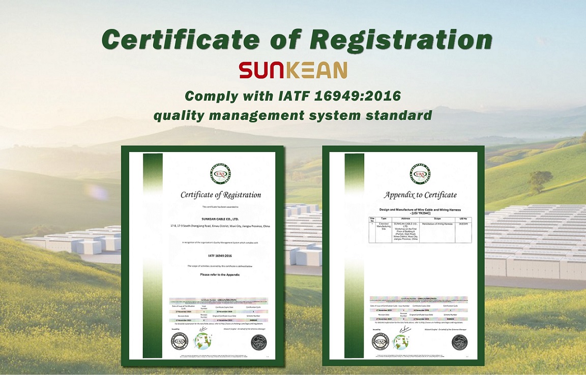شهادة IATF16949 هي معيار نظام إدارة الجودة الذي طورته فرقة العمل الدولية للسيارات (IATF) وتمثل أعلى معايير الجودة في صناعة السيارات في جميع أنحاء العالم. بعد وقت قصير من فوزها بأول نسخة جديدة في العالم من شهادة كابل تخزين الطاقة TUV Rheinland، فازت SUNKEAN بشهادة IATF16949 واستنفدت "SUNKEAN Speed" مرة أخرى.