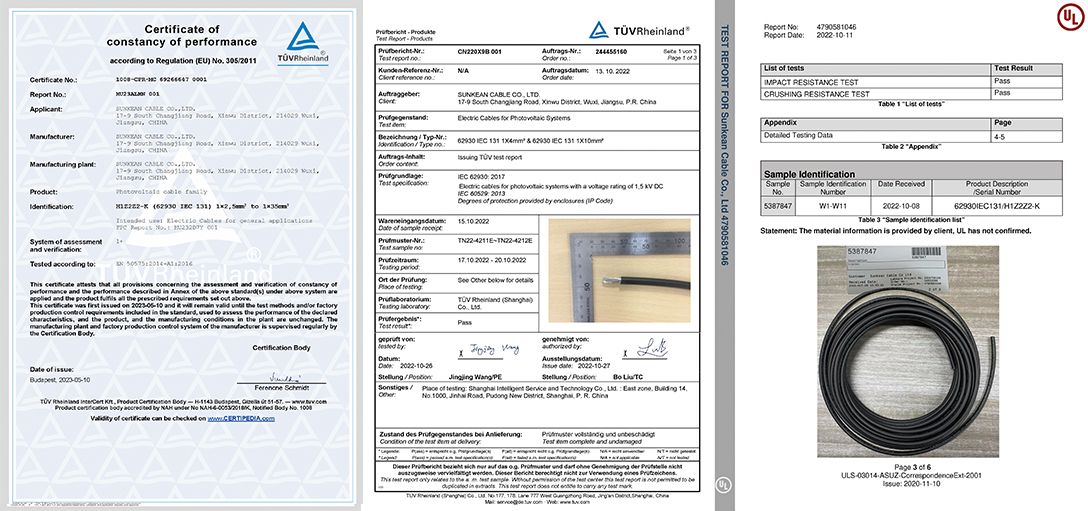 نحن إحدى الشركات المصنعة والموردة للكابلات الكهروضوئية الصينية. تتوافق كابلات SUNKEAN® H122Z2-K الخاصة بنا مع شهادات CPR Dca الصالحة لكل من محطات الطاقة الشمسية والتركيبات الكهروضوئية على الأسطح، والتي يمكنها تبسيط احتياجات مخزون الكابلات الكهروضوئية لديك.
