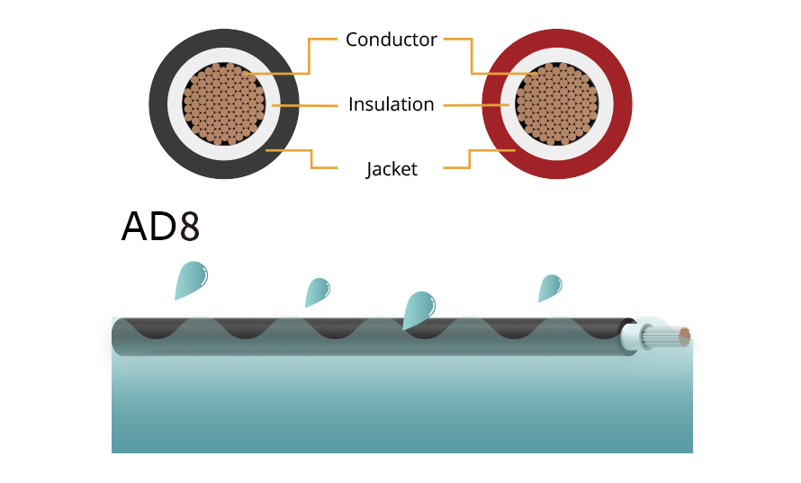 يمكن للكابلات ذات فئة الحماية AD8 أن تتحمل الغمر في الماء لفترة غير محددة. إذا كانت الكابلات الموجودة في تركيب الطاقة الشمسية لن يتم غمرها في الماء لفترات طويلة، فيجب اختيار كابلات AD7.