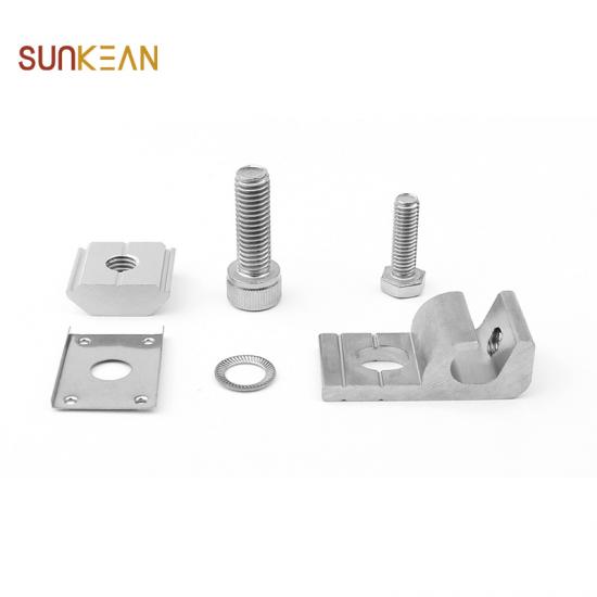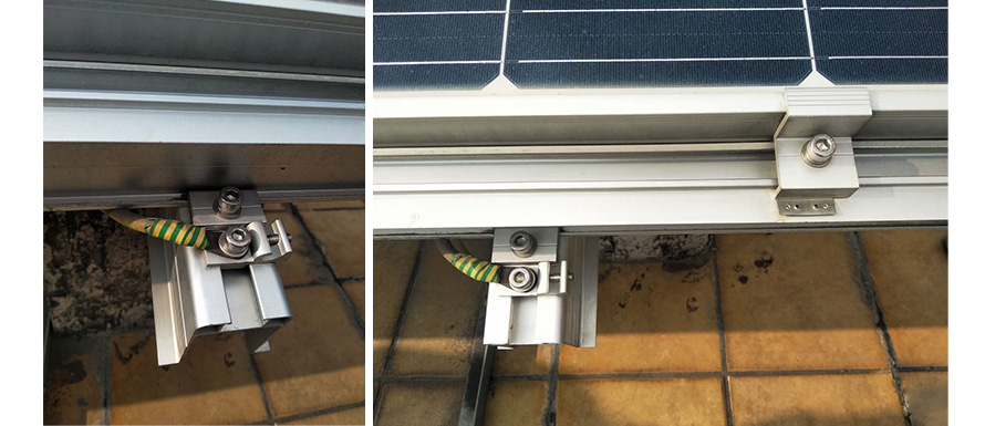 يتم تجميع هذا الجزء عن طريق مسامير التأريض للحماية من الصواعق ومسامير الفولاذ المقاوم للصدأ.عندما يتم شد المسمار ، فإن المسامير الموجودة على مسمار التأريض للحماية من الصواعق سوف تخترق الطبقة المؤكسدة من سكة سبائك الألومنيوم أو سطح أي هيكل معدني موصل آخر ، بحيث تشكل الهياكل المعدنية المتلامسة مع بعضها البعض اتصالًا إلكتروستاتيكيًا محكم الإغلاق ، والخلايا الكهروضوئية ، يتم توصيل الكهرباء الساكنة على الوحدة والدعم الكهروضوئي إلى سلك نحاسي مؤرض ويؤدي إلى الأرض.