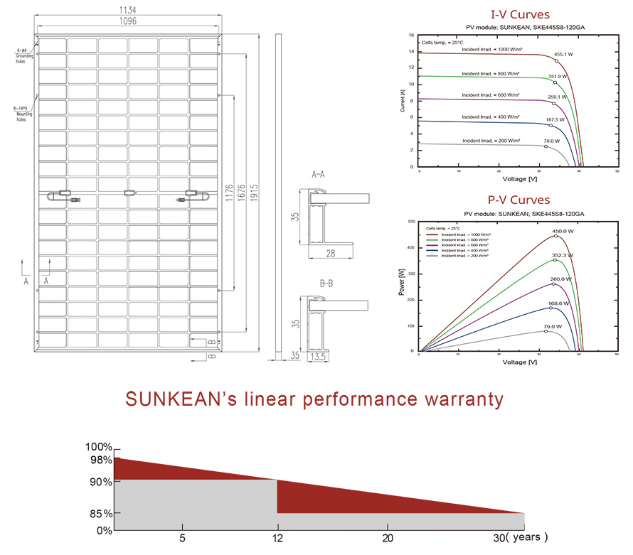الخصائص الكهربائية مع كسب طاقة الجانب الخلفي بنسبة 10٪ مخرج قوي 479 484 490 495 501 الجهد mpp-vmpp (v) 33 . 98 34 . 21 34 . 42 34 . 67 34 . 92 mpp-impp الحالي (a) 14 . 08 14 . 15 14 . 22 14 . 28 14 . 33 جهد الدائرة المفتوحة voc (v) 40 . 75 41 . 01 41 . 22 41 . 48 41 . 75 تيار الدائرة القصيرة ISC (أ) 15 . 05 15 . 11 15 . 20 15 . 27 15 . 32