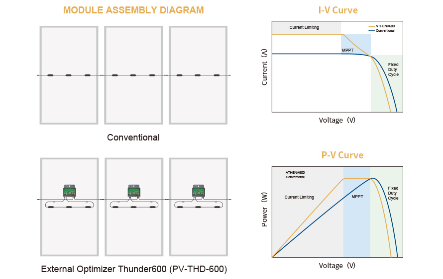 يمكن توصيل المحسنات الخارجية للوحدة الكهروضوئية من sunkean بالجزء الخلفي من كل لوح شمسي في المصفوفة . لتحسين أداء كل لوحة في النظام الشمسي , بغض النظر عن اتجاه الشمس , الظل , أو حتى تلف واحد أو أكثر من اللوحات .