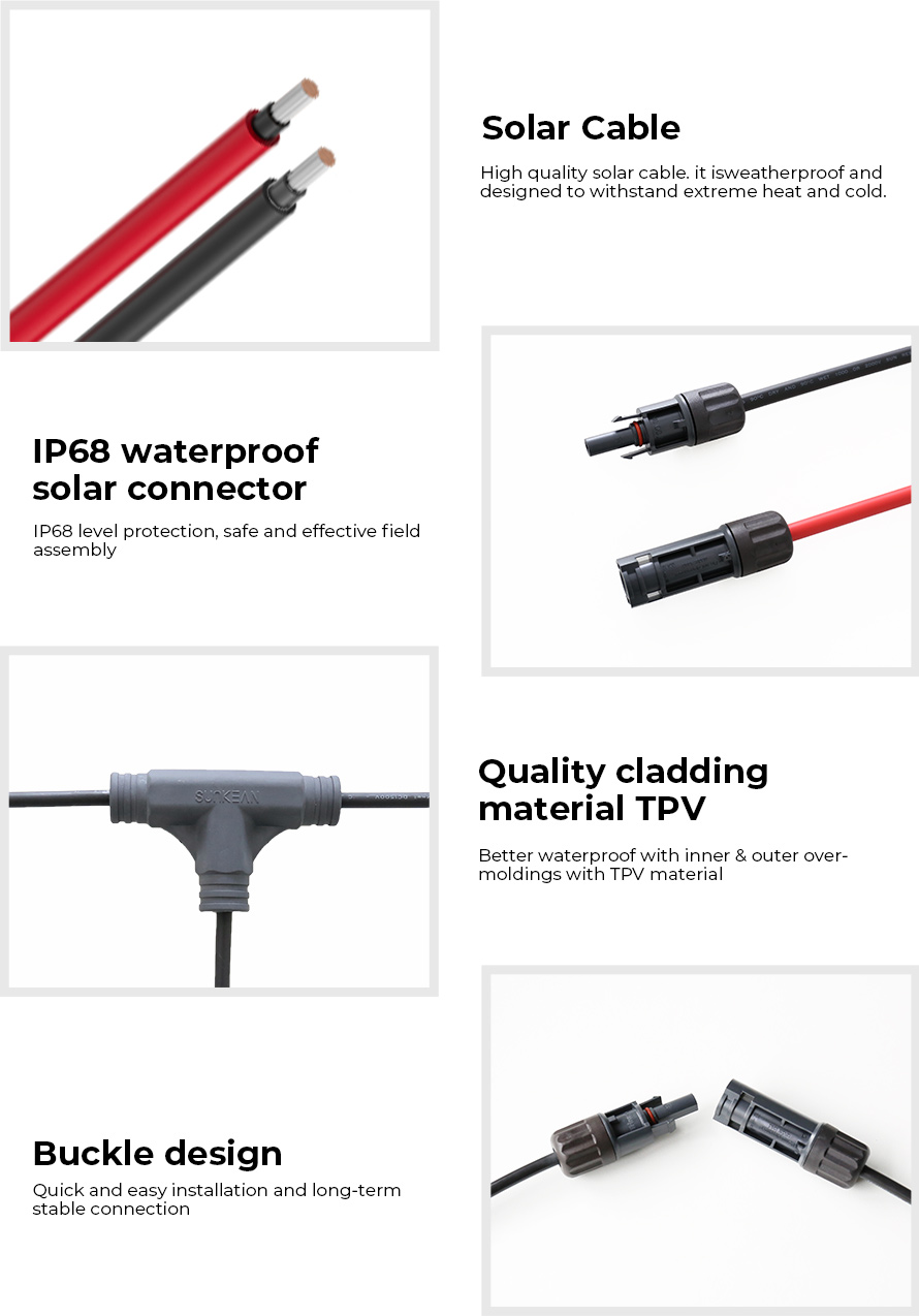 يتمتع حزام SUNKEAN T Branch بتصنيف IP68 لمقاومة الماء ويمكن استخدامه في نطاق واسع من درجات حرارة التشغيل من -40 درجة مئوية إلى +90 درجة مئوية. تضمن مقاومة الاتصال المنخفضة والقدرة العالية على نقل التيار كفاءة عالية للمنتج.
